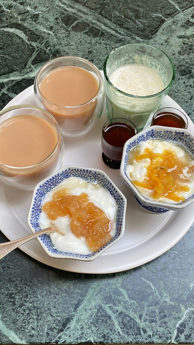 ミルクティ、プロテイン、今日の元気、ヨーグルト+林檎ジャム。