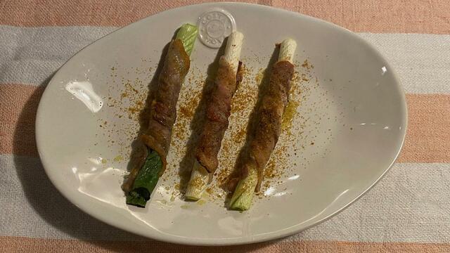長ネギに豚バラの薄切りを巻きつけて焼いたもの(シチリアの屋台料理だそうですよ。Mangia e Bevi! =食べろ、そして飲め!)うちには肉が3本分しかありませんでした。