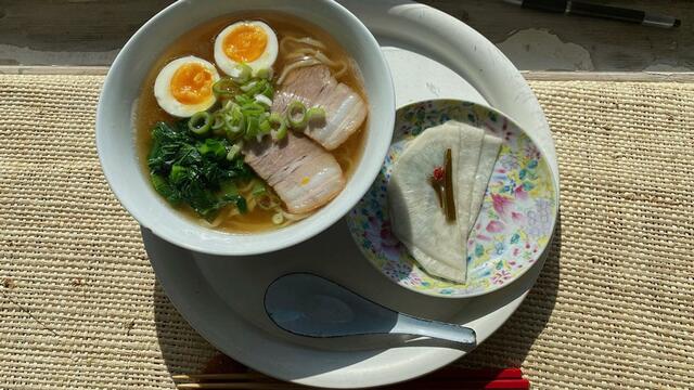 喜多方ラーメン(まるちゃん)(ゆで卵、小松菜、ネギ、焼き豚)。友さん作の焼き豚、いと旨し。手作り千枚漬け。