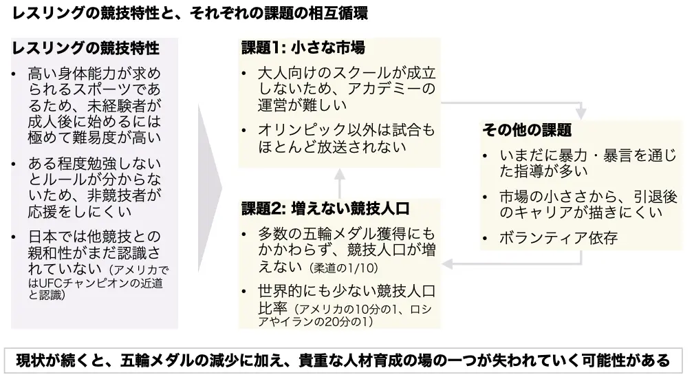 現在、日本のスポーツ界は少子化による競技人口の減少や、経済格差による体験機会の損失という課題に直面しています。特にレスリング界においては、目先の勝利を優先するあまり、選手の燃え尽き症候群やセカンドキャリアの未整備が課題となっています。