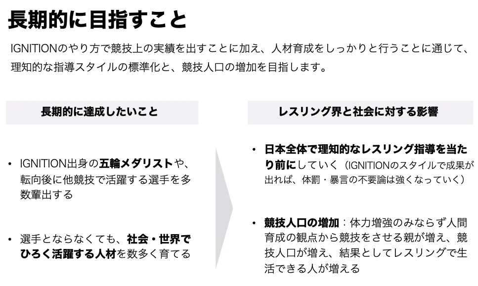 IGNITIONはこれまで「理知的な指導」を掲げ、短期間で多数のメダリストを輩出してきました。しかし、私たちが目指すのは単なる「強い選手」の育成ではありません。レスリングという競技を教育ツールとして捉え直し、社会で活躍できる「人間力」を育むことこそが、競技人口の拡大と業界の発展に繋がると確信しています。 この理念を、保護者の方々だけでなく、地域社会や企業様と共に実現・拡張していくための基盤として、本サポーターズクラブを設立しました。