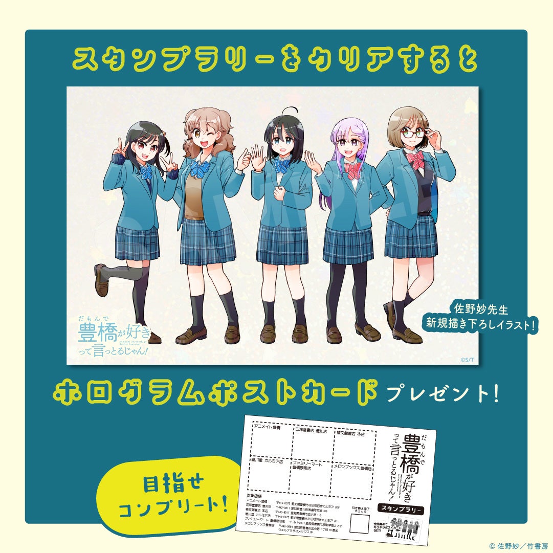 『だもんで豊橋が好きって言っとるじゃん!』コミックスやグッズを購入してスタンプラリーを制覇すると、佐野妙先生描き下ろしカラーイラスト「ホログラムポストカード」が必ずもらえる!