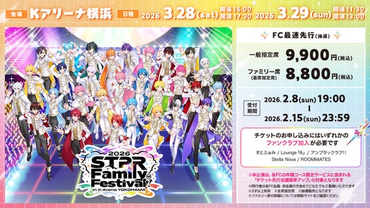 株式会社STPR(本社:東京都渋谷区、代表:柏原真人、以下「STPR」)は、2026年2月7日(土)・8日(日)に東京ドームで開催した大型ライブイベント『STPR Family Festival!! 2026』(通称:すとふぇす)に続き、2026年3月28日(土)・29日(日)の2日間、Kアリーナ横浜にて同イベントを開催することをお知らせいたします。あわせて、本公演について2026年2月8日(日)19:00より、FC最速先行(抽選)のチケット申込受付を開始いたしました。