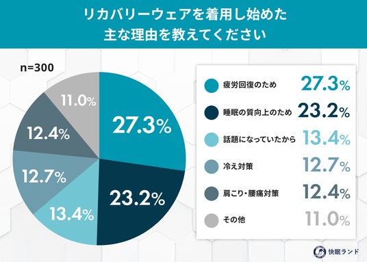 インフルエンザや風邪の流行が続く冬。体調管理への意識が高まる中、「着るだけで疲労回復をサポートする」として注目されてきたリカバリーウェアに、新たな“実感値”が見えてきました。快眠グッズ紹介サイト「快眠ランド」を運営するムーンムーン株式会社は、リカバリーウェアを継続して着用している全国の男女300名を対象に、「リカバリーウェア着用後の体調変化」に関する調査を実施。その結果、着用後に疲労感や冷え、睡眠の質といった体調面の変化を実感する声が多く寄せられました。“疲労回復ウェア”として知られてきたリカバリーウェアが、体調管理の新習慣として捉えられ始めている実態が浮かび上がっています。