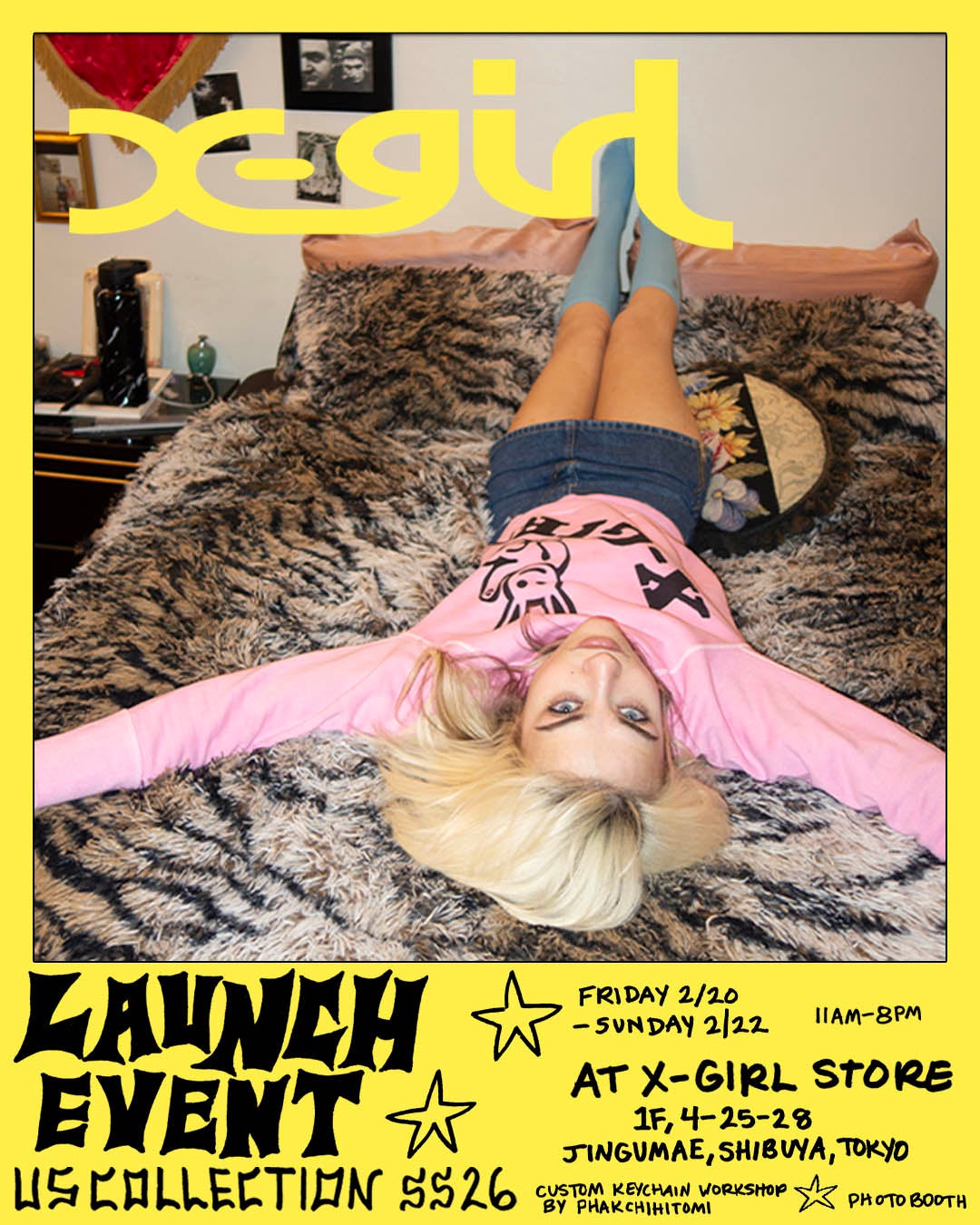 コンテンツ:X-girl US COLLECTION SS26フルラインナップの展示、フォトブース、ぱくちーひとみ氏監修・カスタムキーチェーンワークショップ など