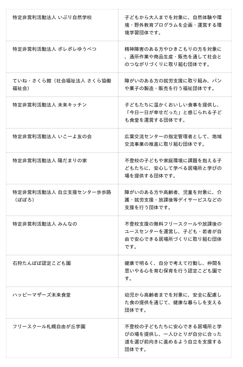 これらの団体は、子ども・福祉・地域づくり・自然体験など、北海道の未来につながる分野で活動されています。