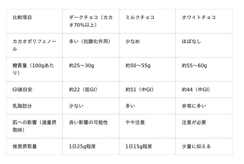 調査では81.3%がチョコレートの種類による肌への影響の違いを知りませんでした。ダークチョコレートに含まれるカカオポリフェノールには抗酸化作用があり、適量摂取であれば肌の老化防止に寄与する可能性があります。一方、ミルクチョコレートやホワイトチョコレートは糖質や乳脂肪分が多いため、摂取量に注意が必要です。