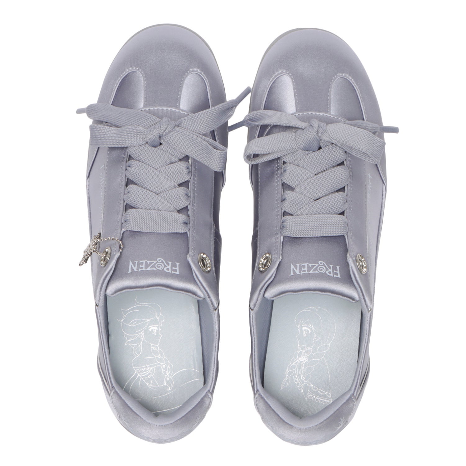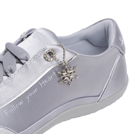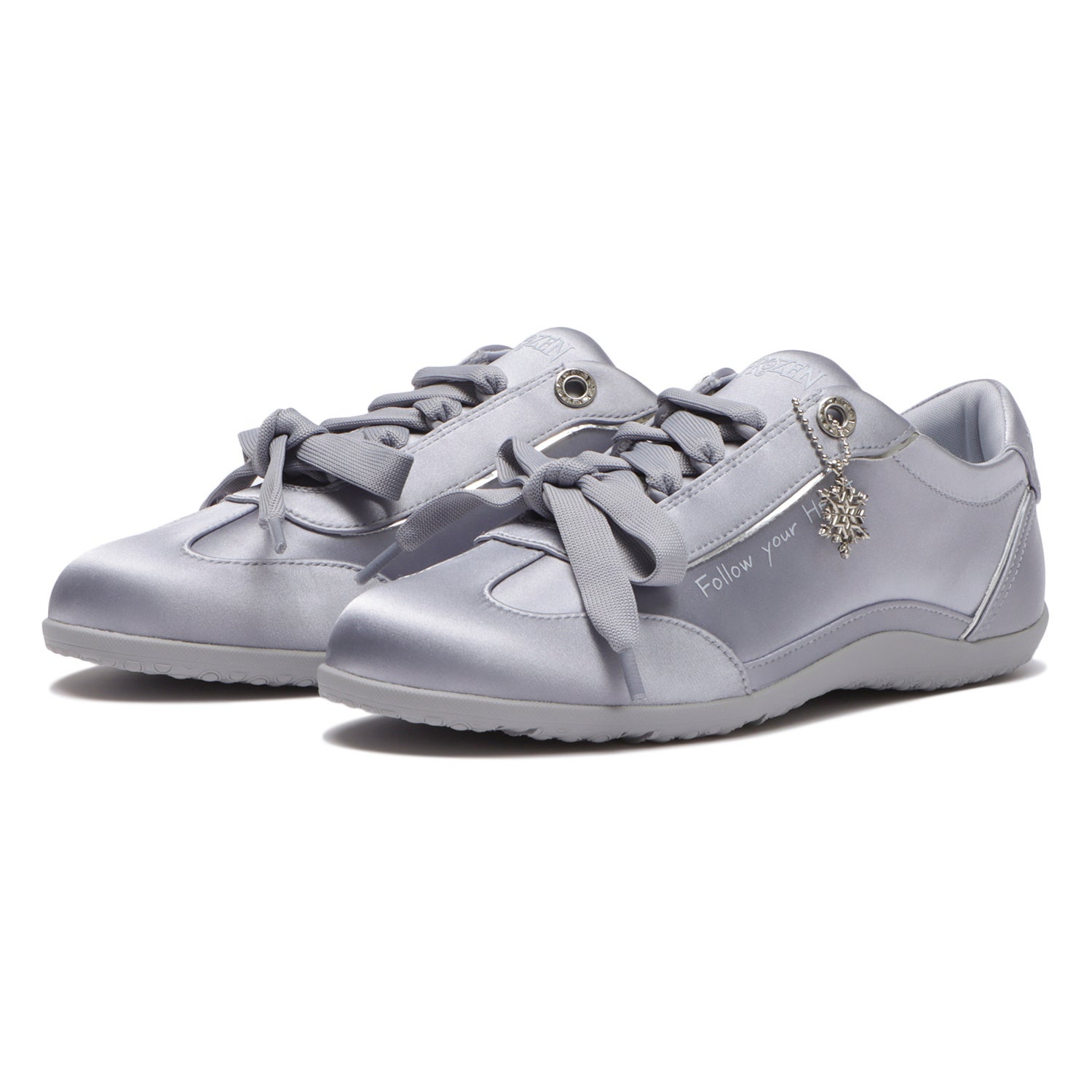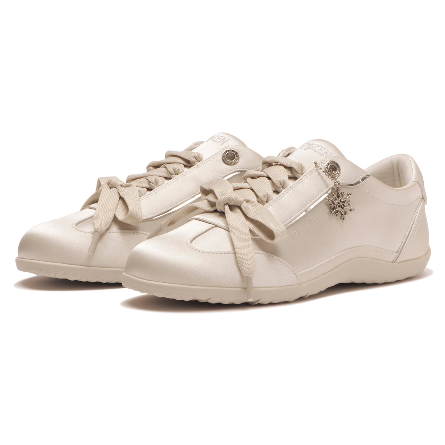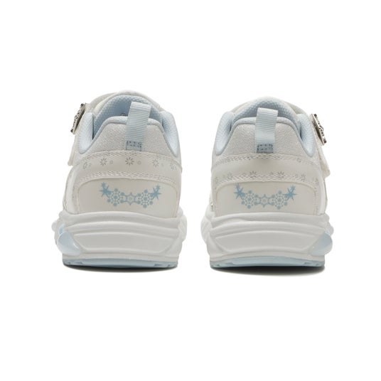 雪の結晶モチーフをあしらったアッパーデザインや、きらめきを感じさせる素材使いで、足元を華やかに演出します。甲部分やサイドには雪柄のディテールを散りばめ、作品の世界観をさりげなく表現しています。