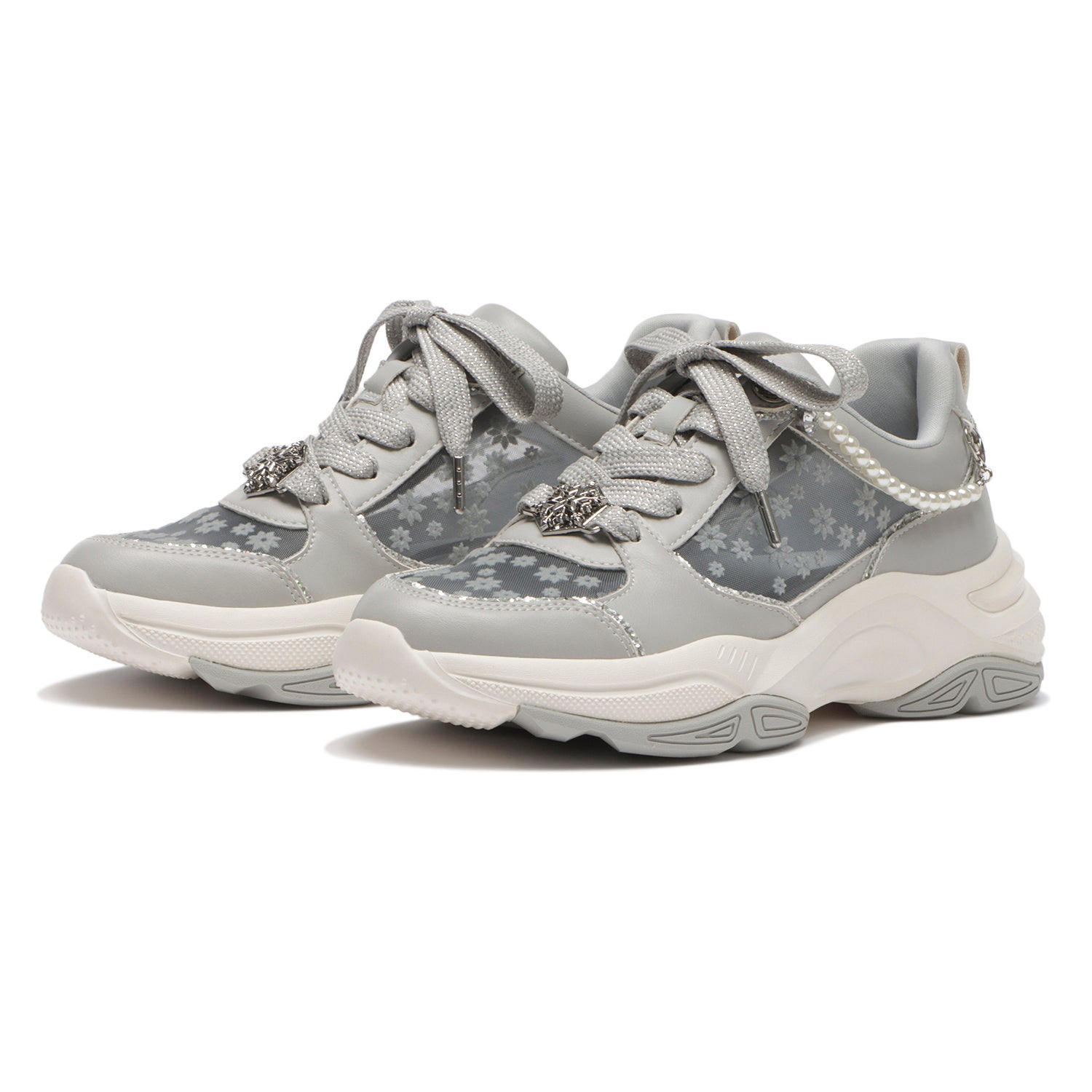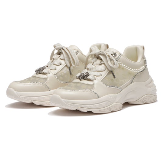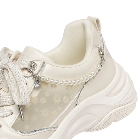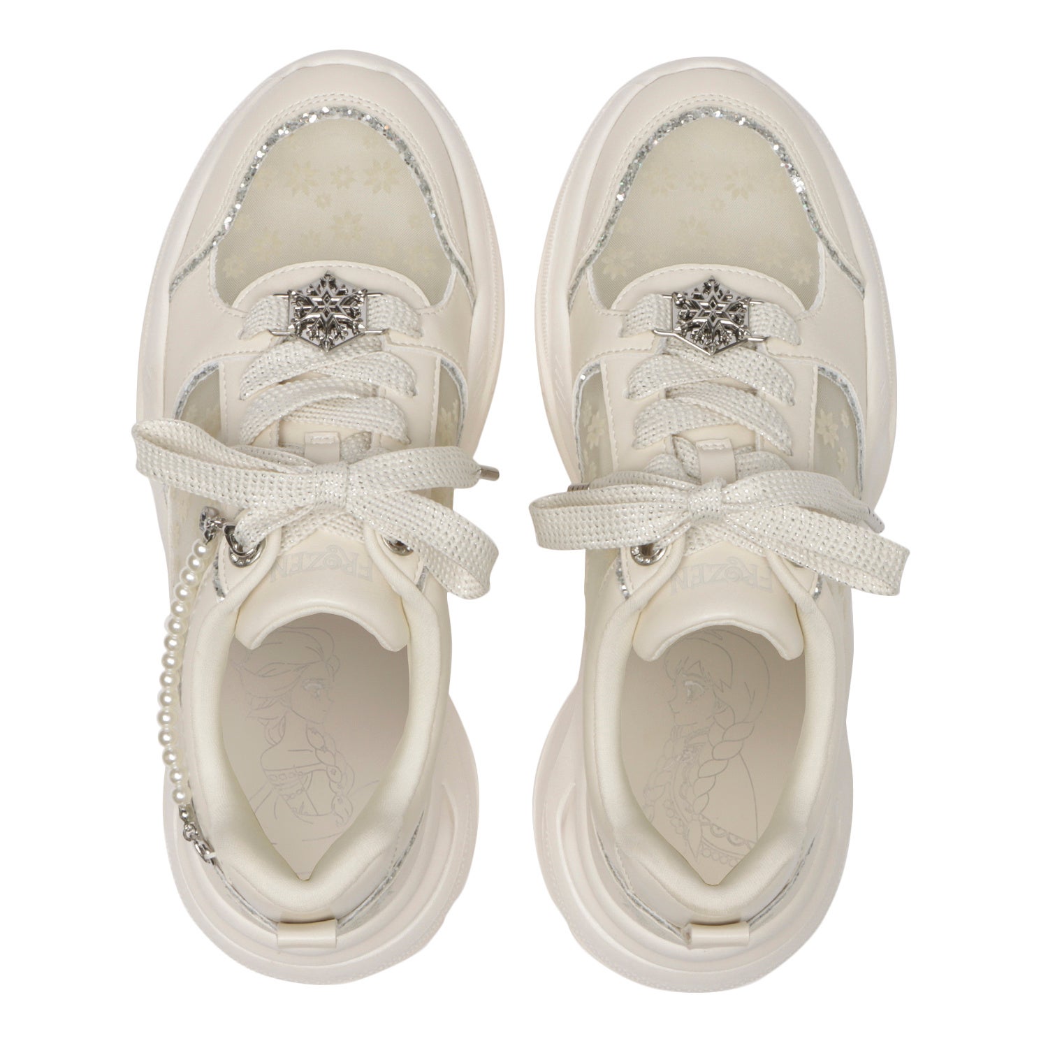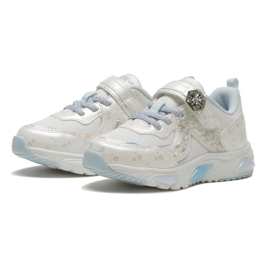 雪の結晶モチーフをあしらったアッパーデザインや、きらめきを感じさせる素材使いで、足元を華やかに演出します。甲部分やサイドには雪柄のディテールを散りばめ、作品の世界観をさりげなく表現しています。