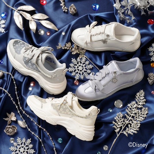 中川翔子さん描きおろしの『アナと雪の女王』のアートを使用し、『アナと雪の女王』の世界観を足元で表現したレディースコレクション。雪のきらめきを感じさせるカラーリングや素材使いに加え、繊細な装飾ディテールを随所に取り入れた2モデルをラインナップしています。