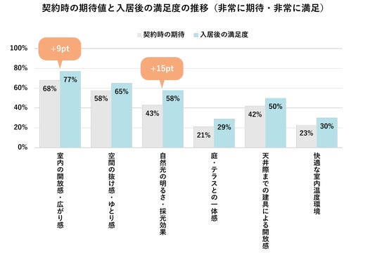 ・ 入居後の満足度は期待を大きく上回り、「明るさ」や「広がり感」など複数項目でポジティブ