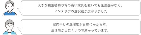 自由回答からは、空間が広く感じるという視覚的なメリットだけでなく、日々の過ごし方や気持ちの変化が見えてきました。実際に寄せられたオーナーさまの声をご紹介します。