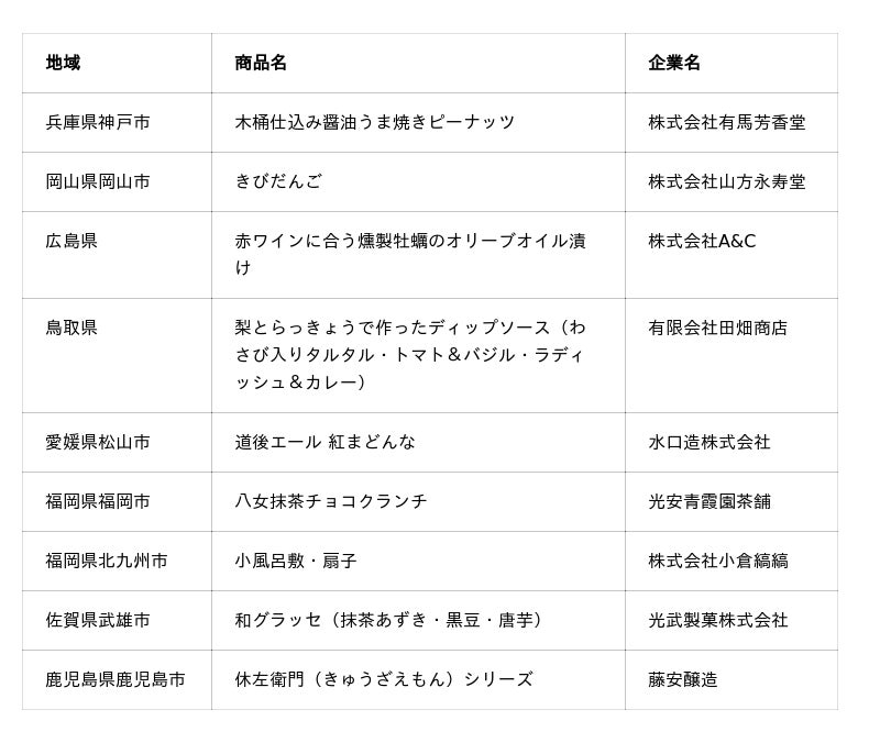 武士の袴にも使われた強く美しいたて縞を現代的に再生した「小倉織の小風呂敷・扇子」(福岡県)や、瀬戸内の牡蠣の濃厚な旨味を贅沢にオイルへ閉じ込めた「赤ワインに合う燻製牡蠣のオリーブオイル漬け」(広島県)をはじめ、計22ブランドを展開します。