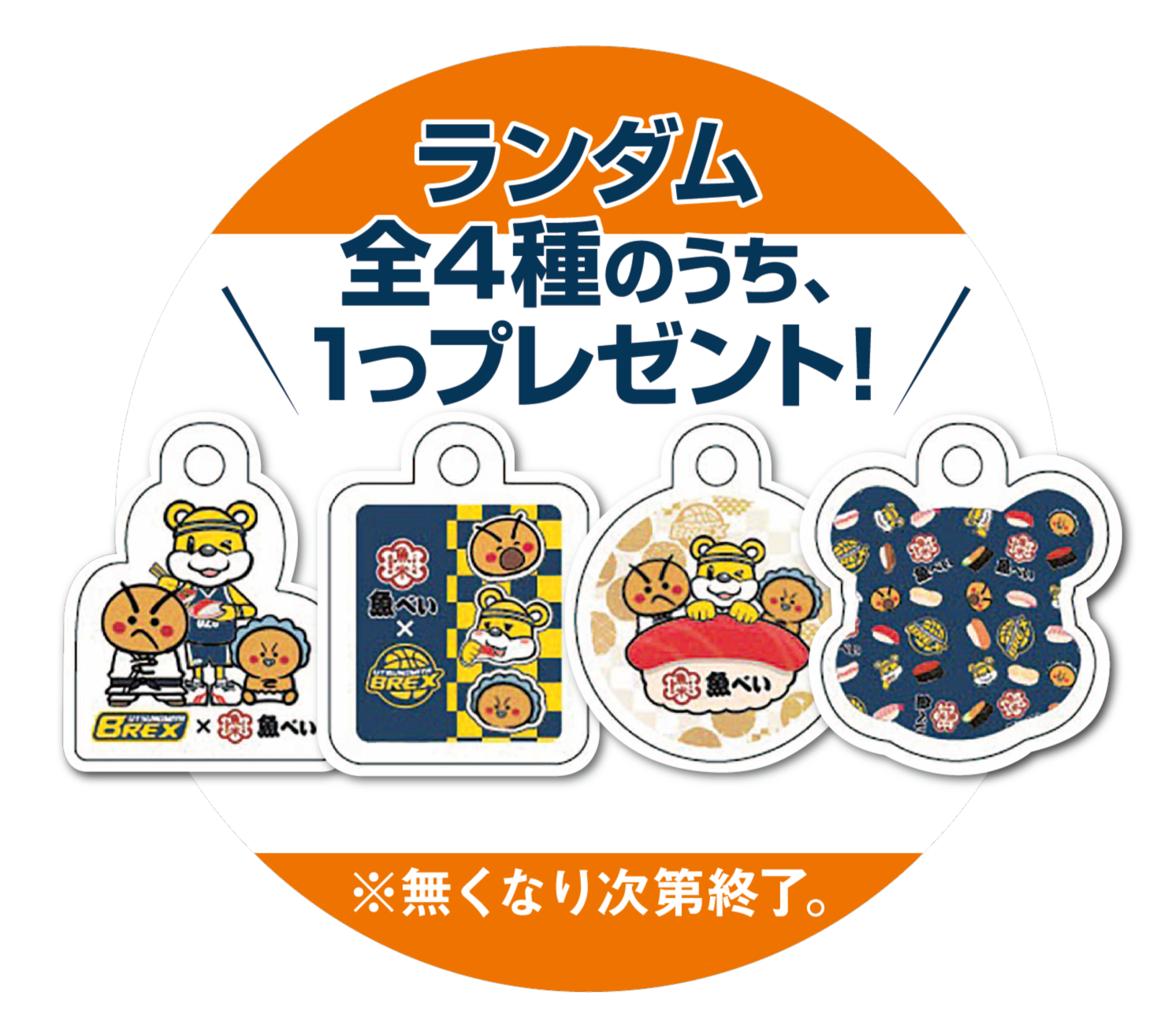 全国の魚べい、元気寿司にて対象のコラボ商品「宇都宮ブレックス ヴィクトリーセット」をご注文いただくと、オリジナルアクリルキーホルダーをランダムで1種プレゼントいたします。