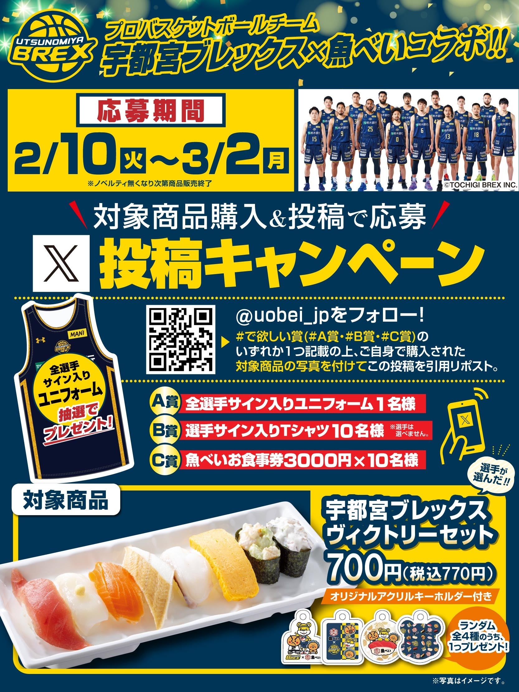 また、コラボ期間中には、魚べい公式X(旧Twitter)を活用したキャンペーンも実施します。公式アカウントをフォローのうえ、注文した「宇都宮ブレックス ヴィクトリーセット」の写真を添えて対象投稿をリポストすると、全選手サイン入りユニフォームや選手サイン入りTシャツ、魚べい・元気寿司お食事券などが抽選で当たります。