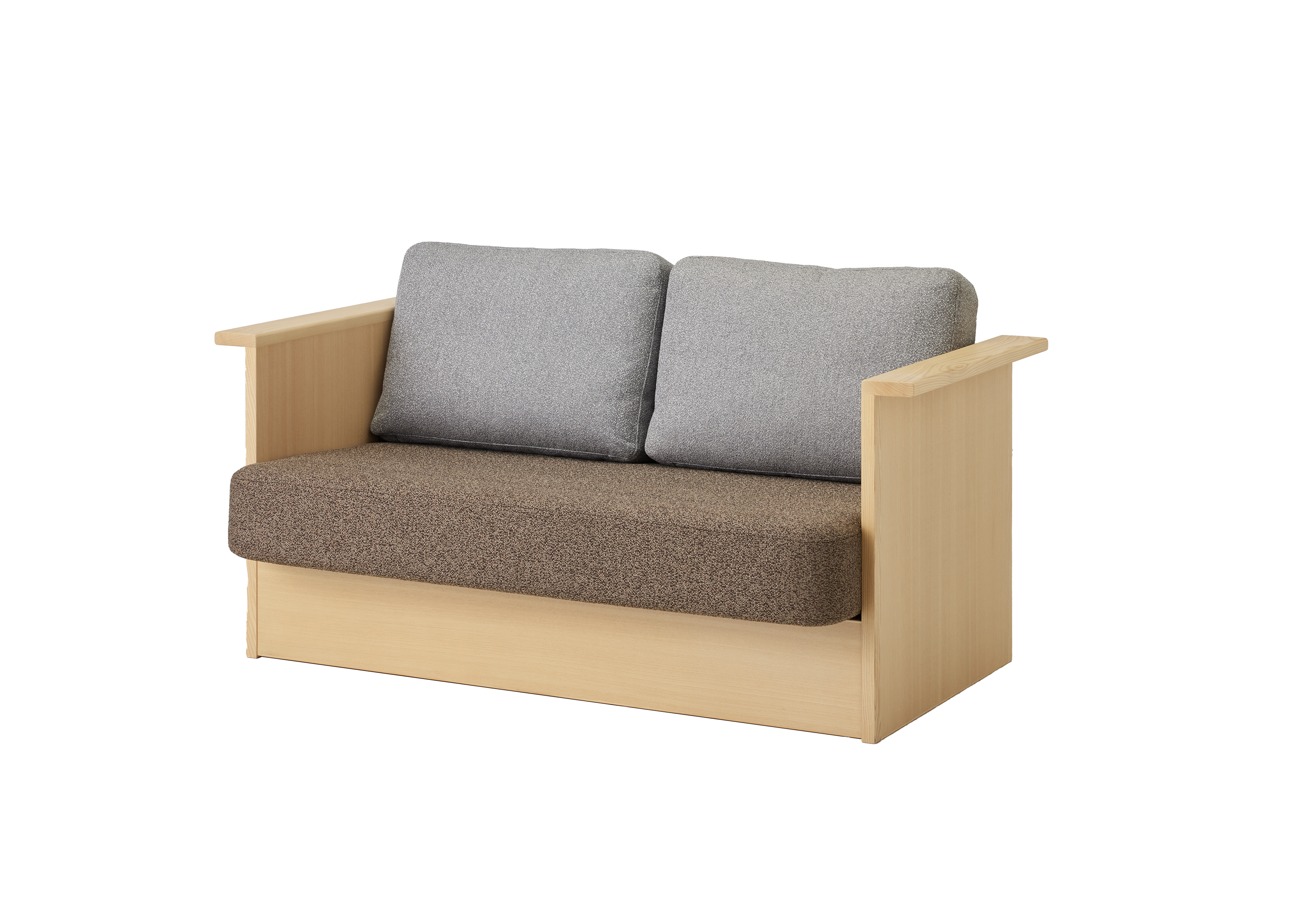 (株式会社大雪木工)コンパクトながらも細部まで心地よさを追求したソファです。幅広のアームはスマートフォンやグラスを置くのにちょうど良く、座面下には防災用品やブランケットなどを収納できるスペースを備えています。必要な機能をさりげなく組み込みながら、見た目はすっきりと端正。日本の住空間に寄り添うための工夫が詰まっています。
