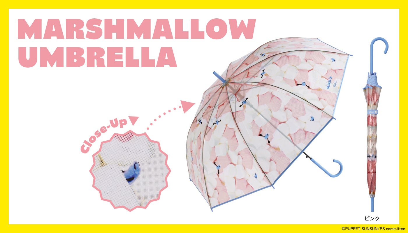 ふんわり淡いピンクと白いマシュマロ、そしてスンスンをプリントした楽しいデザインのビニール傘。傘を縁取るパイピングをはじめ、持ち手、石突きなどのパーツはブルーで統一しました。