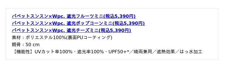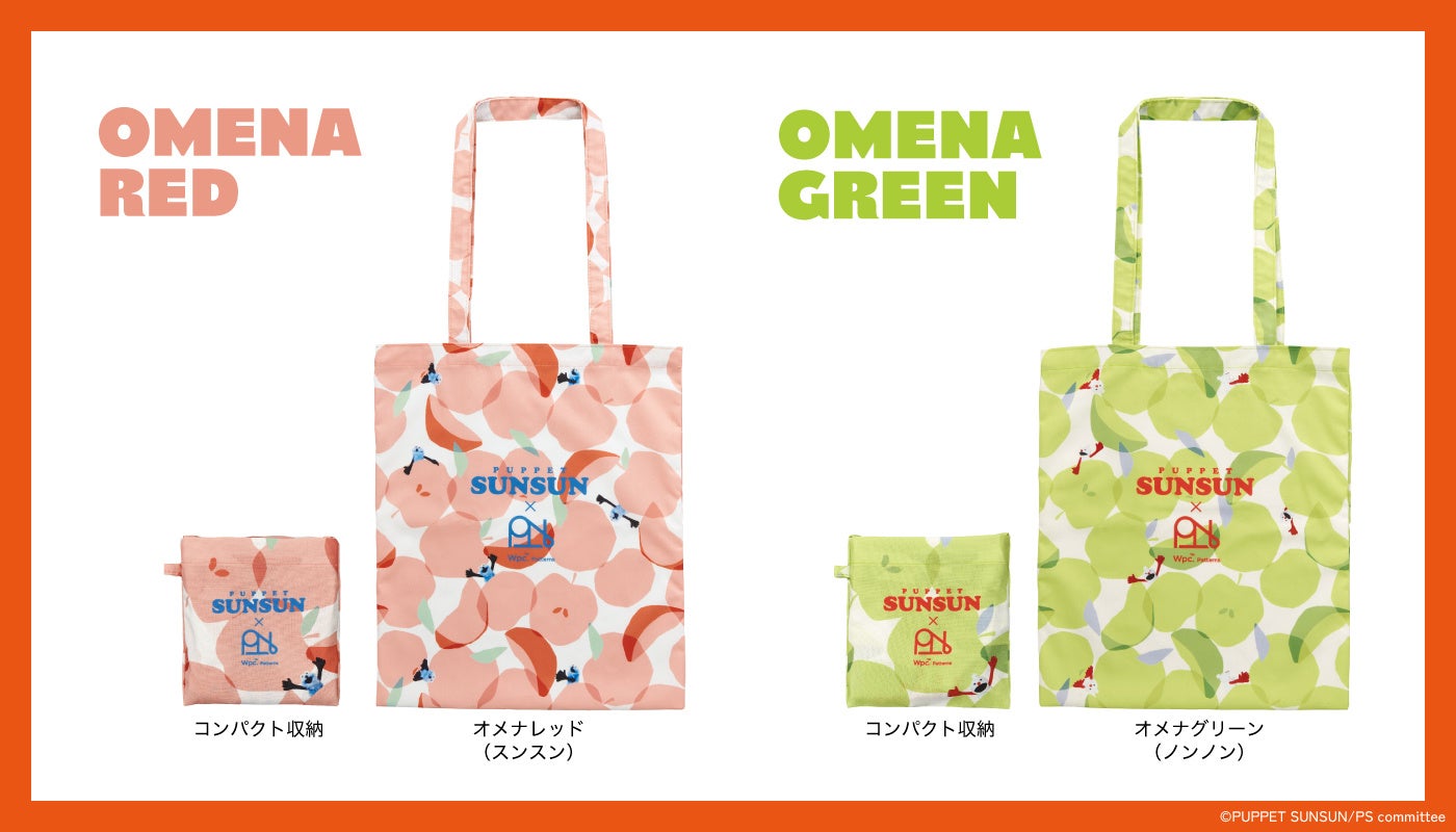 今回は”食べ物”をテーマに、雨の日も晴れの日もスンスンたちと一緒に楽しめるビニール傘1種、折りたたみ日傘3種、トートバッグ2種、スクエアポーチ2種の全8種のアイテムを展開。ブルー、オレンジ、イエローなどレトロポップな色使いのWpc.の日傘は、UVカット率100%・遮光率100%・UPF50+の生地*を使用。はっ水加工も施されているので雨の日でもお使いいただける晴雨兼用です。りんごをモチーフにしたWpc. Patternsの人気テキスタイルデザイン”オメナ”から顔をのぞかせるスンスンとノンノンの雑貨も、パペットスンスンファンにはたまらないラインナップです。また、商品にはクリアなタグが付いています。