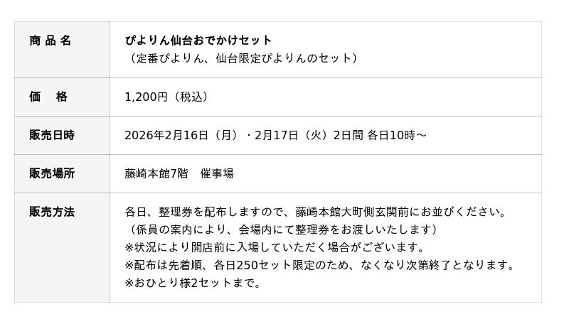 ジェイアール東海フードサービス株式会社(本社:愛知県名古屋市、代表取締役社長:岩下賢一)のオリジナルスイーツ「ぴよりん」が藤崎本館(宮城県仙台市)で開催される「第23回全国駅弁大会とうまいもの市」にて、2026年2月16日(月)・2月17日(火)の2日間、数量限定で販売します。