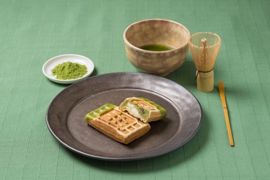宇治抹茶と北海道産あずきを使用したなめらかな抹茶餡と白玉を包んで焼き上げました。抹茶チョコで仕上げた和を感じるワッフルです。