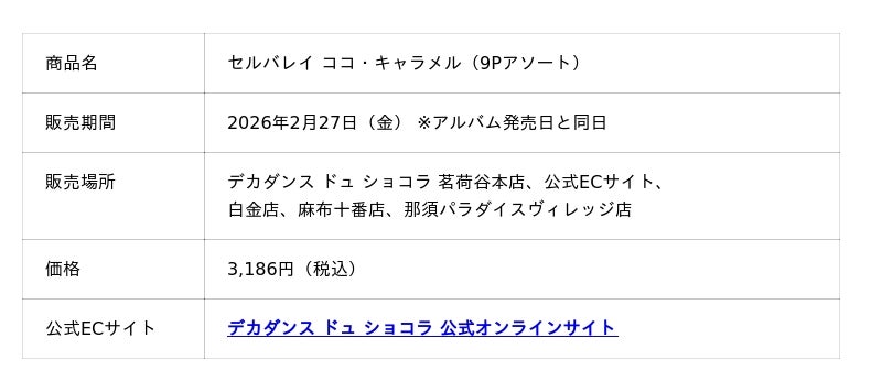 今回の再登場は、SelvaRey Rumのクリエイティブ・ディレクターを務めるブルーノ・マーズ氏の待望のニューアルバム発売(2月27日)を祝した特別企画です。世界が熱狂する音楽の解禁とともに、彼の情熱が注がれたラム酒と、熟練の職人が作り上げるショコラのハーモニーをお楽しみいただけます。■ 商品概要:至福のボンボンショコラ『セルバレイ ココ・キャラメル』
