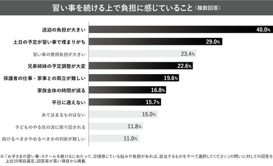 習い事を続ける上での負担としては、「送迎の負担」(40.0%)や「土日の予定調整」(29.0%)が上位に挙げられており、習い事が家庭全体のスケジュールに影響を与えている実態がうかがえます。