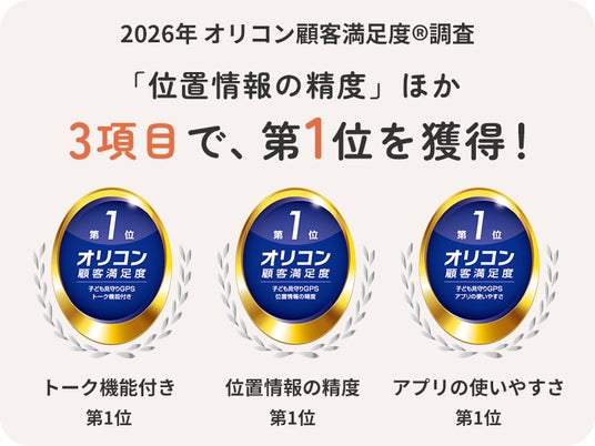 2026年 オリコン顧客満足度(R)調査 子ども見守りGPS 位置情報の精度 第1位, 2026年 オリコン顧客満足度(R)調査 子ども見守りGPS トーク機能付き 第1位, 2026年 オリコン顧客満足度(R)調査 子ども見守りGPS アプリの使いやすさ 第1位