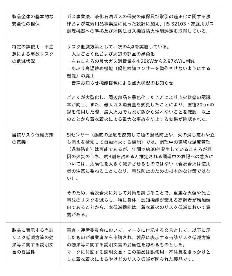 「SAFULL+」は、想定した危害シナリオ「ビルトインこんろ使用中の着衣着火による火傷」に対して、次の評価軸を全て満たしていることから「+あんしん」を受賞しました。