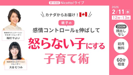 (株)パステルコミュニケーション(本社:東京都豊島区、代表取締役:吉野加容子)が運営する、発達障害・グレーゾーンの子どもを育てるママがいつでも学べて相談できるオンライン子育て塾「Nicotto!塾」は、2026年2月11日(水)お昼12時より、「カナダからお届け!親子の感情コントロールを伸ばして怒らない子にする子育て術」をテーマにオンラインライブを開催いたしますhttps://desc-lab.com/nicotto202201/?prt0211