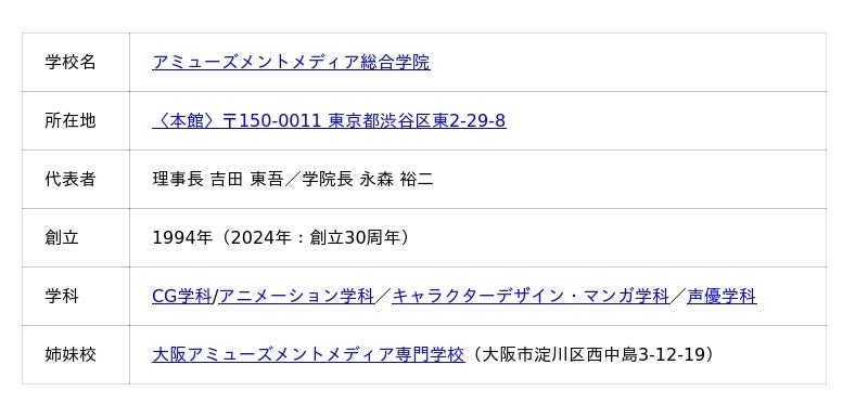 2年間でエンタテインメント業界の第一線で活躍できる"即戦力"の育成を目的に、1994年に設立。2024年で開校30周年を迎えました。「産学共同・現場実践教育」を理念とし、AMGグループの制作現場でプロとして実践経験を積むことで、真の実力を身につけ就職・デビューへと導く独自の教育システムを展開しています。