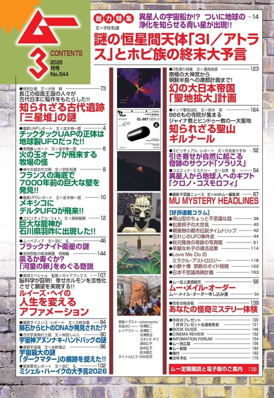 2色刷り特集 幻の大日本帝国「聖地拡大」計画/実用スペシャル ルイーズ・ヘイの人生を変えるアファメーション/チックタックUAPの正体は地球製UFOだった!!/火の玉オーブが飛来する牧場の怪/メキシコにデルタUFOが飛来!!/知られざる聖山ギルナール/隕石からヒトのDNAが発見された!?/宇宙神アヌンナキのハンドバッグの謎/宇宙最大の謎「ダークマター」の痕跡を捉えた!!/ミシェル・ハーイクの大予言2026 ほか●好評連載