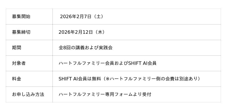 「日本をAI先進国に」を掲げる株式会社SHIFT AI(本社:東京都渋谷区、代表取締役:木内翔大、以下「当社」)は、シングルファミリー支援を行う一般社団法人ハートフルファミリー(本社:東京都新宿区、共同代表理事:西田真弓、以下「ハートフルファミリー」)と共同で、AIを日常の道具として使いこなし、自立したスキル習得を目指す実践型サークル「おうちAIラボ Season 2」を2026年2月7日(土)より開始いたします。
