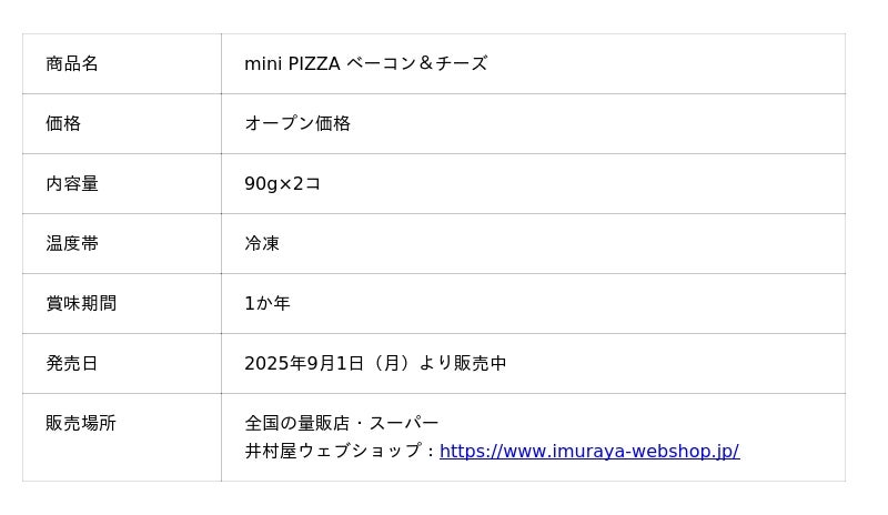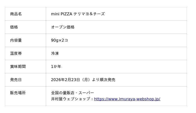 井村屋株式会社(本社:三重県津市高茶屋七丁目1番1号、社長:岩本 康)は、新商品『mini PIZZA テリマヨ&チーズ』を2026年2月23日(月)より全国で発売します。