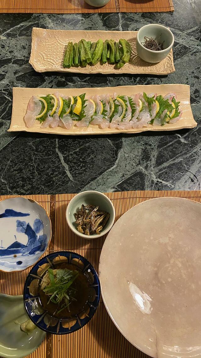 前菜は焼いたシシトウ、真鯛+大葉+湘南ゴールドの重ね(カプレーゼ的)、もずく酢、田作り。寒い夜におでん、最高です!