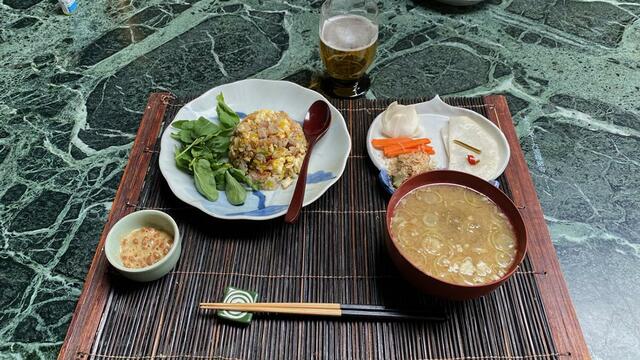 残り物のごはんをチャーハンに(低温調理の塩麹豚ロース、卵、ネギなど)とルッコラを一緒に食べる。漬物(蕪、にんじん、きゅうり)、納豆、千枚漬け。茗荷ととろろ昆布の味噌汁。