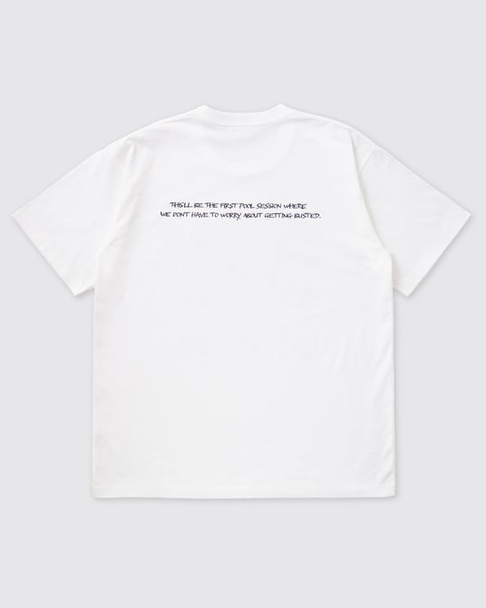 ボディ・生地はロゴTと同じものを採用し、フロントには、当時の映画公開時のコピー “They came from nothing to change everything.” のタイポグラフィをシルクスクリーンプリントで表現。バックには、夜のダウンヒルシーンの幻想的な街並みがボディに溶け込むよう、Tシャツの生地色を活かしたブラックマジックのインクジェットプリントを施しました。