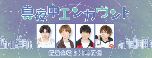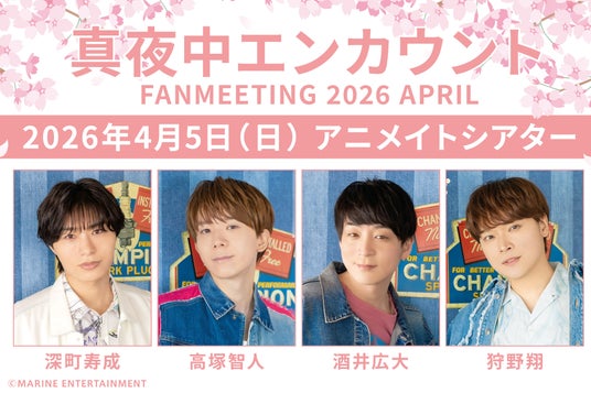深町寿成さん、高塚智人さん、酒井広大さん、狩野翔さんの4人でおくる真夜中カルチャーエンカウント番組『真夜中エンカウント』が、2026年4月5日(日)にアニメイトシアターにて番組ファンミーティングを開催します。2回公演で第1部の開演は14:15、第2部の開演は17:15。参加チケットは現在抽選受付中です。