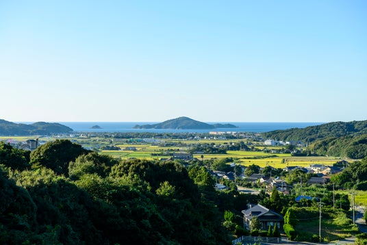 青龍湖(舟郡ダム)から一望する川棚平野と響灘・孤留島(厚島)