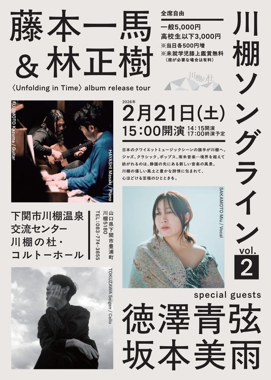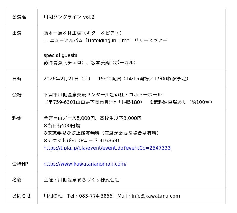 川棚温泉まちづくり株式会社(下関市川棚温泉交流センター指定管理者/社長:高瀬利也)は、2026年2月21日(土)、川棚の杜・コルトーホール(下関市川棚温泉交流センター)にて、ライブコンサート「川棚ソングライン vol.2」を開催します。