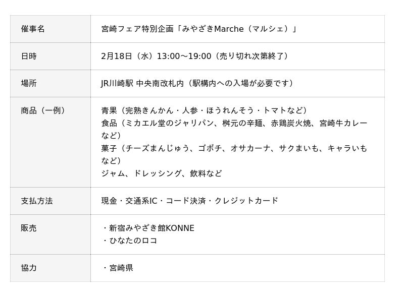 ホテルメトロポリタン 川崎(運営/日本ホテル株式会社、総支配人/金田 文典)はオールデイダイニング「Terrace and Table」にて開催中の「宮崎フェア」の出張イベントとして、2月18日(水)にJR川崎駅中央南改札内にて「みやざきMarche(マルシェ)」を開催いたします。