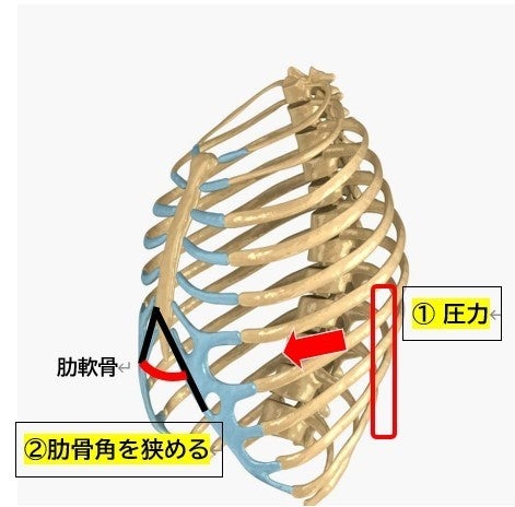 後脇の肋骨7~10番に弱い圧力を加えると、前側軟骨がわずかに閉じる方向へ動く これにより下部胸郭が立体的に広がり、