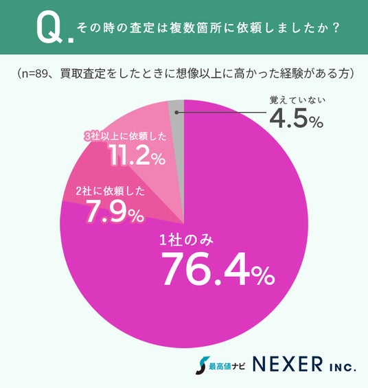 想像以上に高値で売れた経験がある人のうち、76.4%が「1社のみ」に査定を依頼していました。