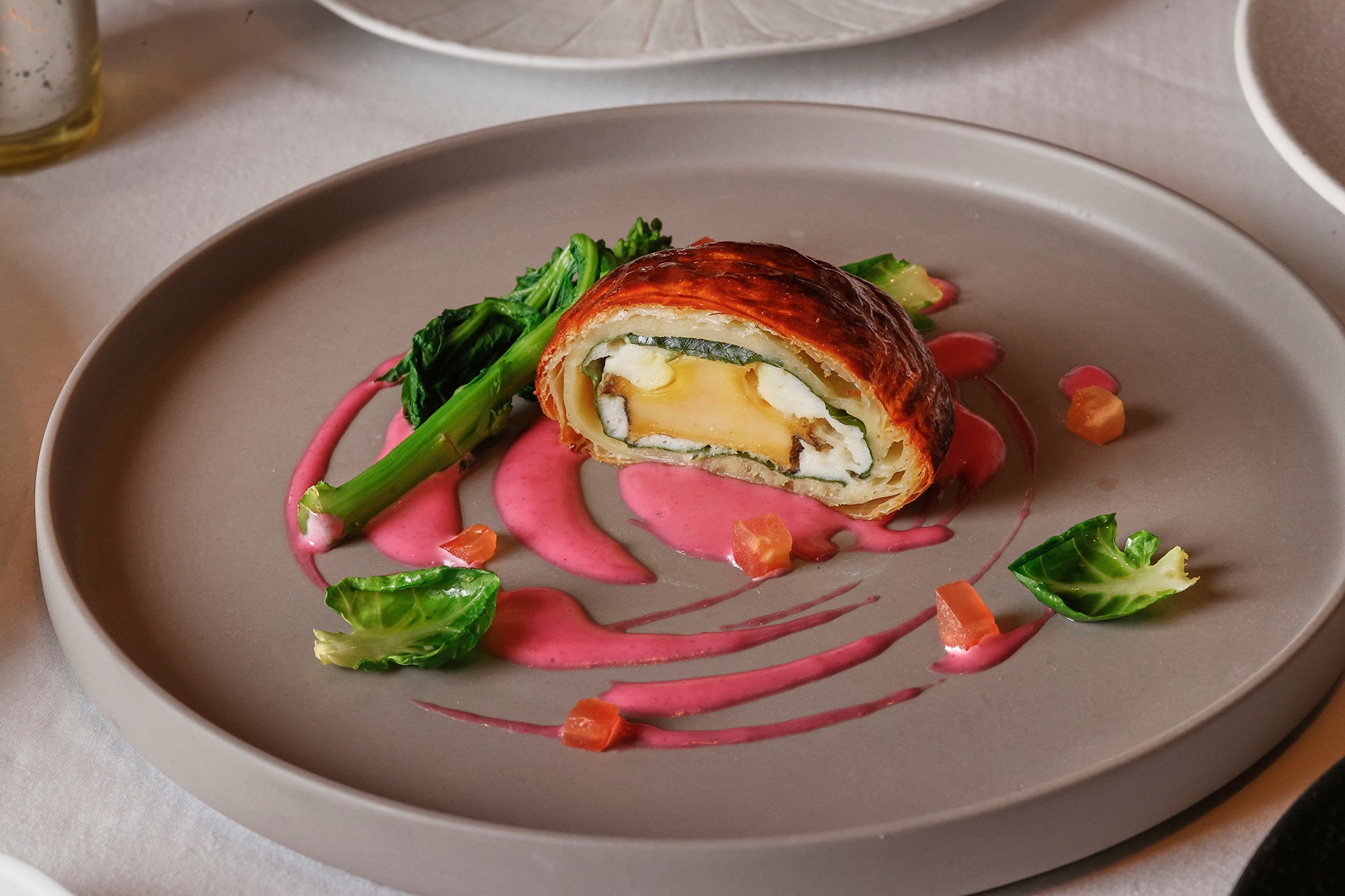 パスタは、桜エビと桜マスを使用したタリオリーニで彩り豊かな春を表現。魚料理は、蝦夷鮑のパイ包み焼きを桜色のソースで仕立て、優雅な一皿に仕上げました。メインの肉料理は、口どけの良い佐賀牛サーロインのグリエに、軽やかな酸味のあるベリーソースで肉の甘みをより引き立てます。