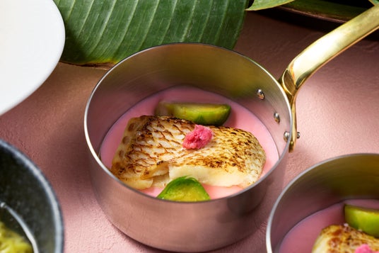 「桜鯛のロースト 桜の白ワインソース」は桜をテーマにした、シェフおすすめのメニューです。旬の桜鯛をローストし、桜のリキュールと桜の葉を使用した白ワインソースをかけ、小さなフライパン型の器に盛り付けました。桜エビと芽キャベツを添えて、桜咲く春のやさしさを表現しています。