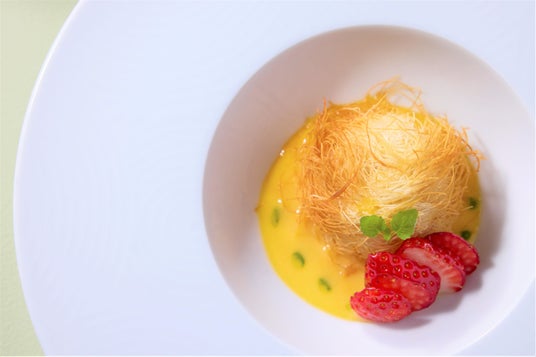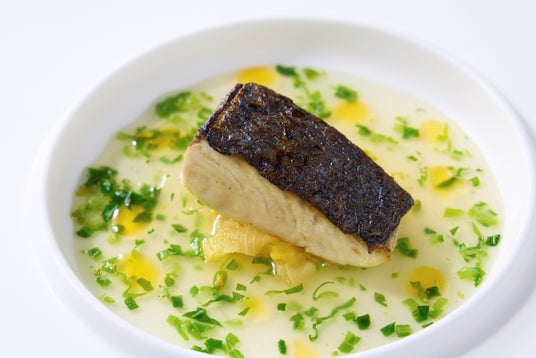 「鰆とアンディーブ」は香ばしく焼き上げた鰆に、オレンジの果汁でやさしく炊き上げたアンディーブのほろ苦さが、味を引き立てます。オレンジの甘酸っぱさが、春らしいコントラストを演出します。
