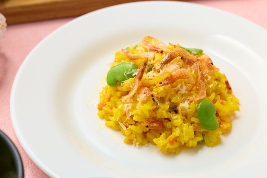 「桜エビとそら豆のサフランリゾット」はイタリア産のお米(カルナローリ)を使ったサフランライスを桜エビとそら豆で、彩り豊かに仕上げました。桜エビのピンク・そら豆のグリーン・サフランのイエローで春を思わせる、あたたかく色鮮やかな逸品です。
