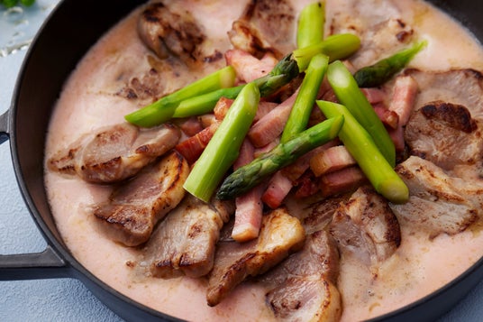 「豚肉とベーコンの白ワインソース」はマリネした肩ロースをローストし、桜の風味を加えた白ワインソースを絡めました。桜の香りと味わいで、春を満喫できる逸品です。