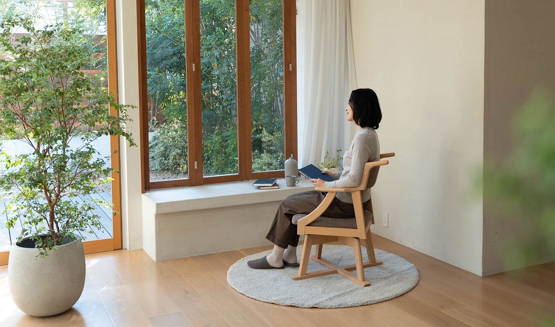 食べることも、くつろぐことも、無理なく続けられる。「食を楽しむための椅子【みのり】回転タイプ」は、毎日のダイニングチェアとしてはもちろん、ご高齢の方のサポート用や介護シーンにも活躍。常設しても生活感が出にくい、上質な佇まいの一脚です。