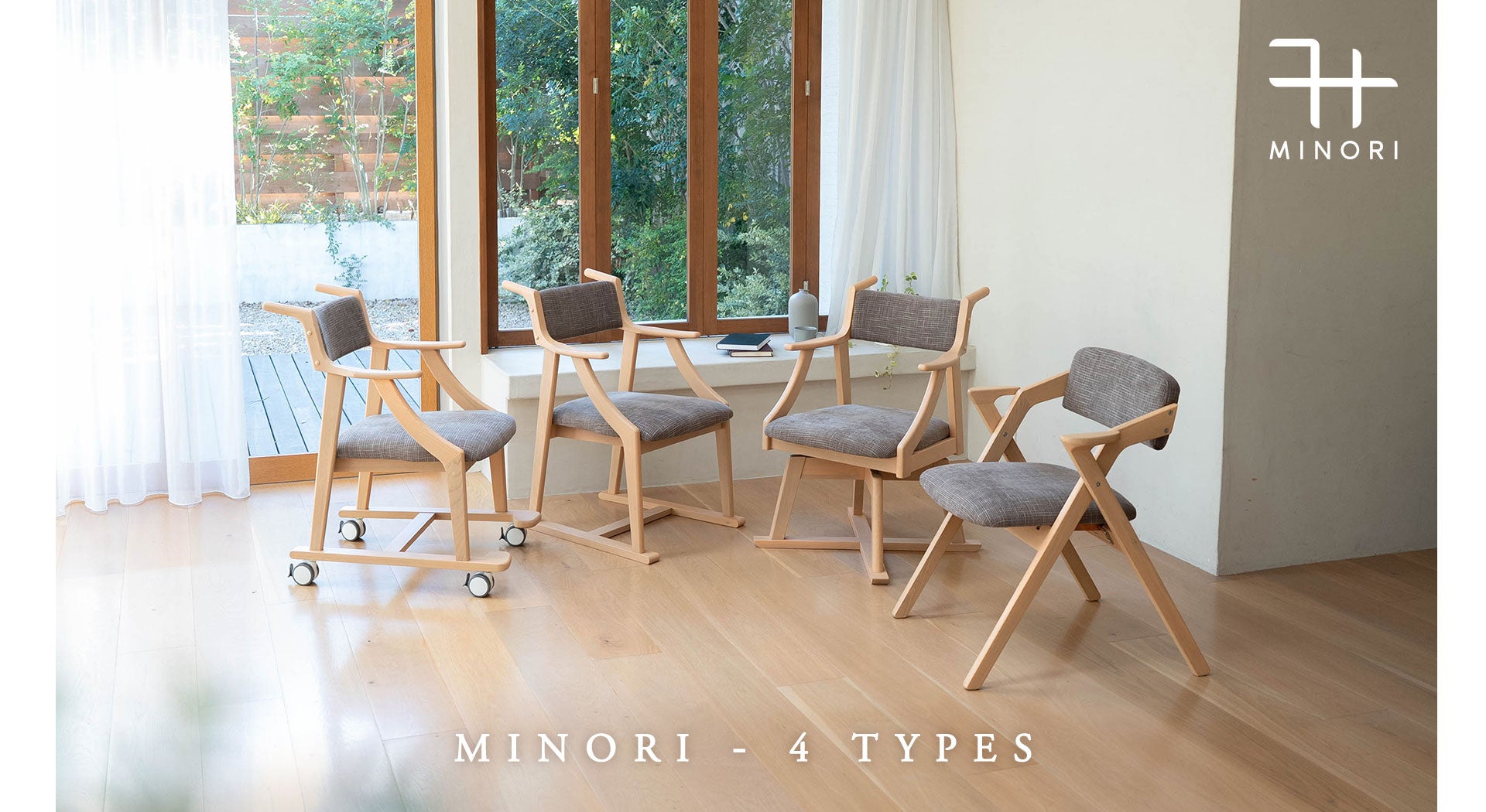 『食を楽しむための椅子~みのり~』は、暮らしや身体状況に合わせて選べる「オリジナル」「回転」「サポート」「折りたたみ」の4タイプを展開しています。