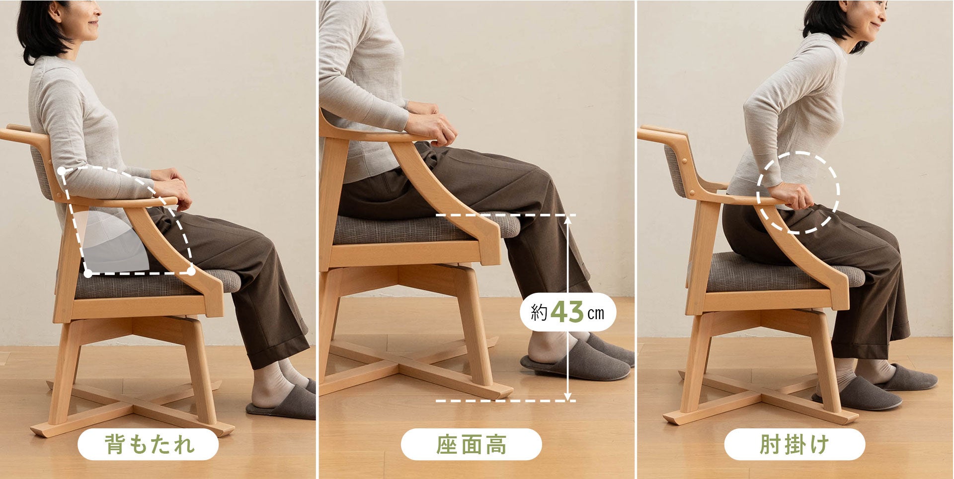 約43cmと一般的なダイニングテーブルで使いやすい高さに設計。ご高齢の方でも足裏が床につきやすく、座ったときの安心感と立ち上がりやすさを高めています。